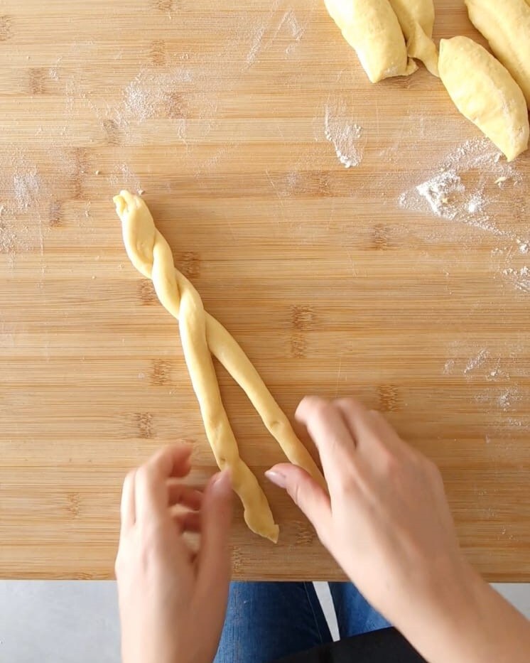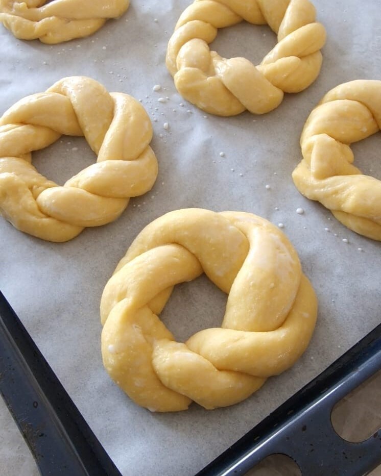 Em seguida, trance dois cordões juntos e feche as extremidades formando um ninho. Coloque os ninhos não muito próximos uns dos outros em uma assadeira forrada com papel manteiga e deixe crescer por mais 30 minutos.