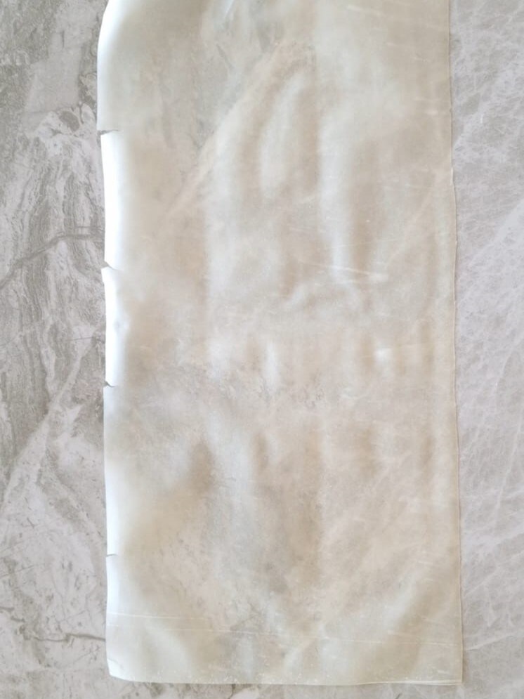 Estenda a massa filo, formando um retângulo de cerca de 25-30cm. Pincele a superfície com a manteiga derretida.