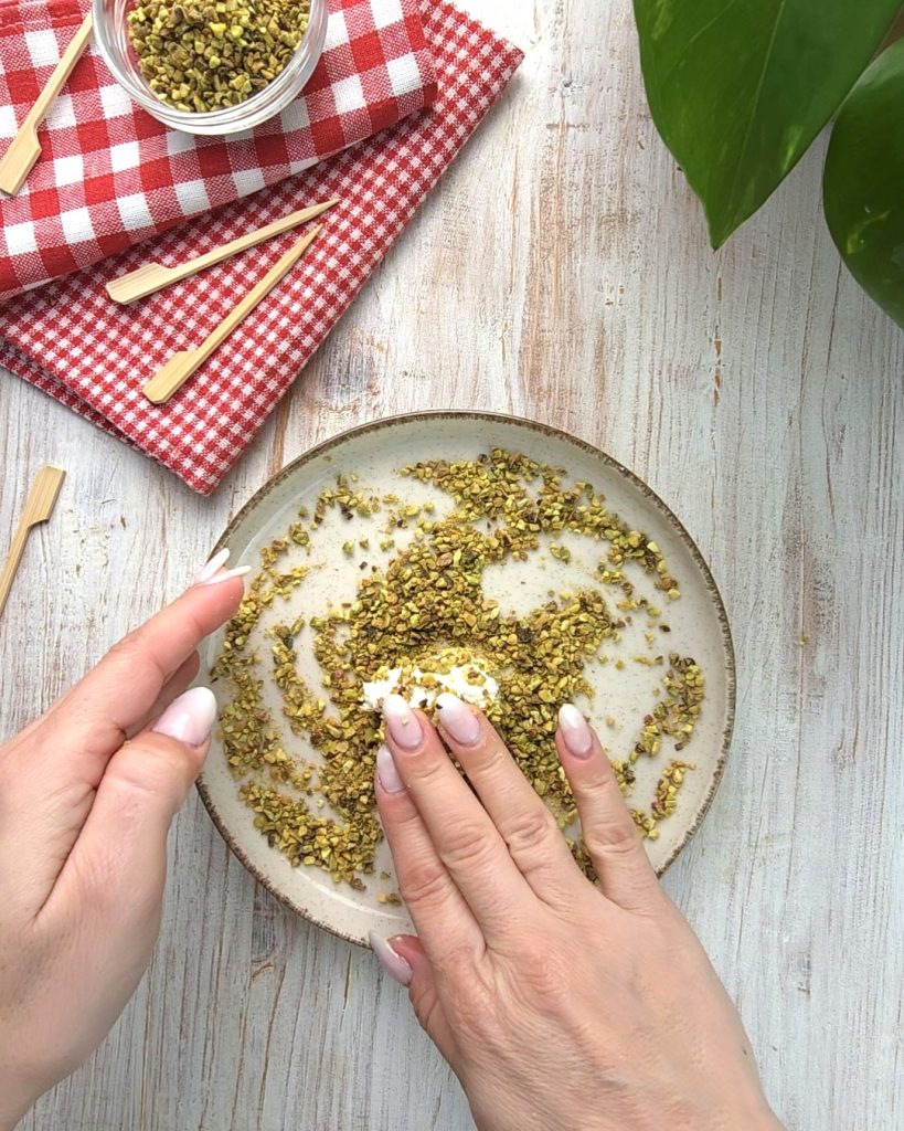 • Pegue uma pequena porção com a mão, forme bolinhas e em seguida role-as nos pistaches e nas amêndoas picadas.