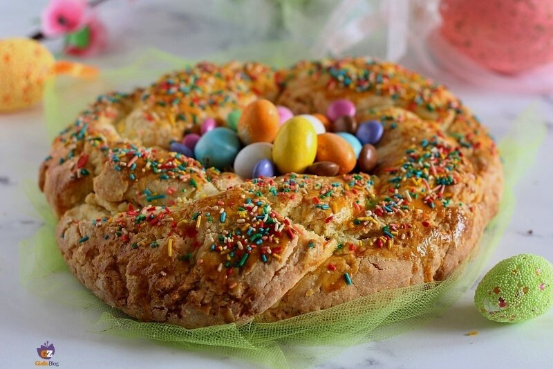 Doce típico de Páscoa da minha cidade, San Severo, a scarcella não pode faltar nas nossas mesas! Tem o sabor das coisas boas, feitas em casa como se fazia antigamente, e refazê-la me traz de volta à infância, quando assistia minha mãe a preparar essa trança que ela colocava na forma, pincelava com gema de ovo e deixava para nós a tarefa de cobri-la com confeitos! Ver crescer e dourar no forno era um espetáculo …