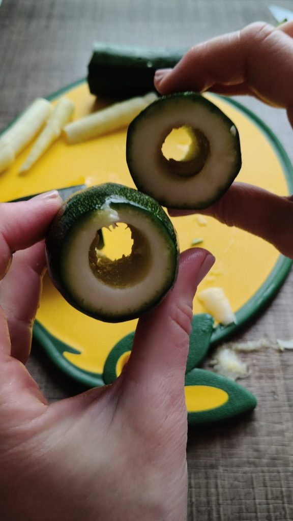 Qual abobrinha usar? As abobrinhas médias e retas são perfeitas para esvaziar com o descascador. Se preferir, você também pode usar abobrinhas redondas, ajustando os tempos de cozimento.