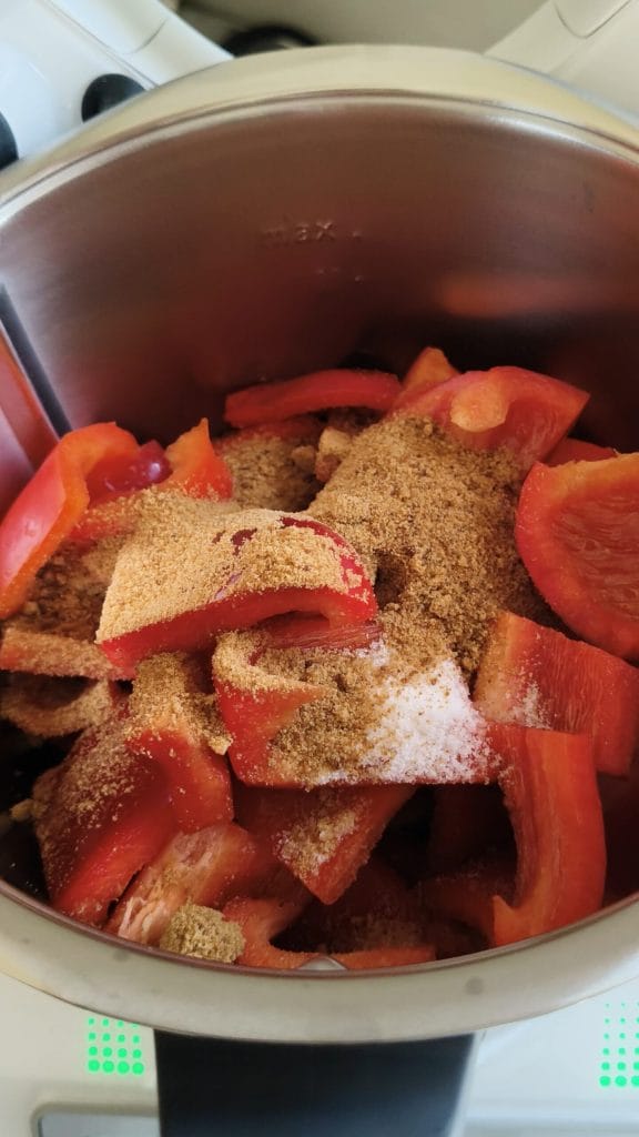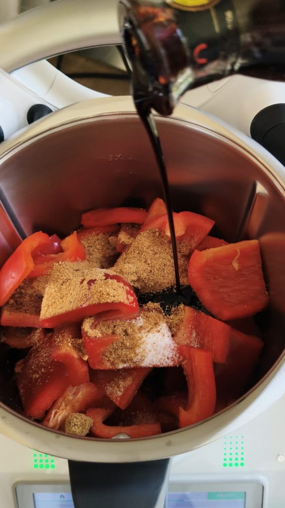 O acompanhamento de pimentões agridoce com Bimby é um prato fácil e leve, perfeito para o verão. É preparado com poucos ingredientes: apenas pimentões vermelhos (ou coloridos), mel, vinagre balsâmico, alho e azeite extravirgem. A doçura natural dos pimentões é realçada pelo açúcar mascavo integral, enquanto o vinagre balsâmico adiciona uma nota ácida irresistível.