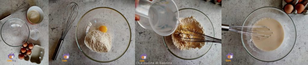– Juntar em uma tigela o ovo com a farinha peneirada e misturar; adicionar a água sempre mexendo com um batedor de mão até obter uma massa lisa e sem grumos.
