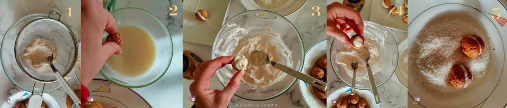 – Colocar a farinha de coco em uma bandeja ou prato raso e rolar os beijos de amaretti.