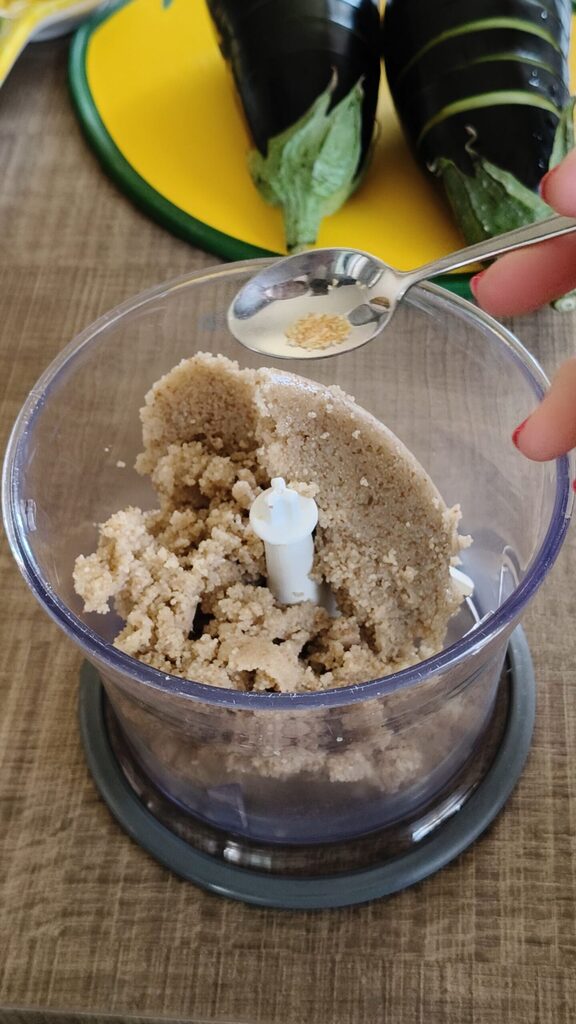 Coloque as berinjelas em uma assadeira, salgue, unte com um pouco de óleo e asse em forno pré-aquecido a 180°C por 40/45′. Ou na air fryer (se for grande ou com berinjelas menores, 180°C por cerca de 20′).