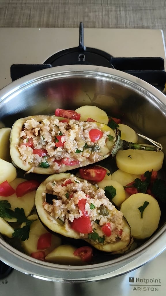 Berinjelas recheadas na panela com batatas e tomates, a receita da mamãe que é passada na família há anos.