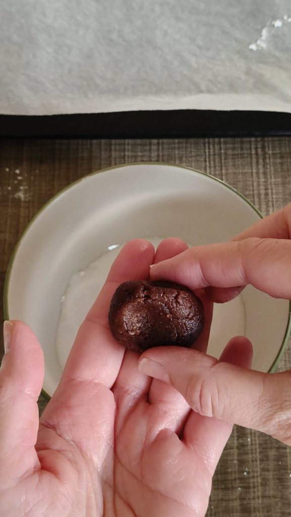 Forme bolinhas de cerca de 20g e pressione levemente para criar covinhas.