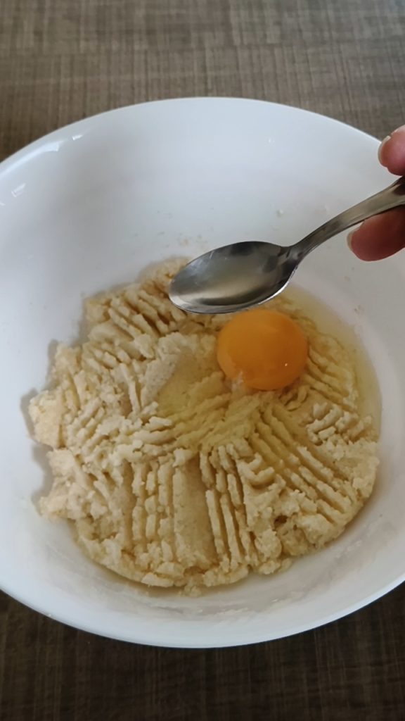 Em uma tigela, despeje o açúcar e a manteiga amolecida; amasse bem com um garfo para misturar bem os dois ingredientes. Depois, adicione o ovo e o vinagre de maçã (serve para fixar a cor e não é perceptível nos biscoitos) e misture bem.
