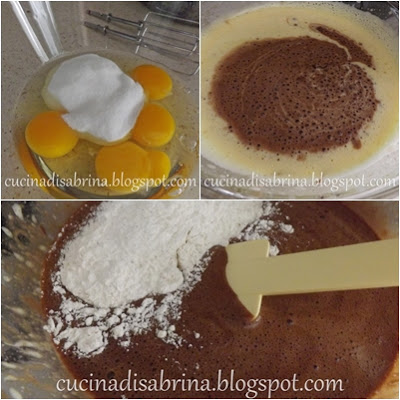 – Enquanto a mistura esfria, bata os ovos com o açúcar, junte então o chocolate derretido e incorpore em duas vezes a farinha peneirada com o fermento.
