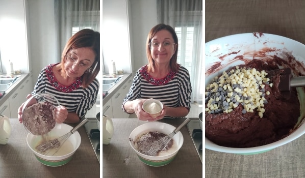 – Despeje os ingredientes secos nos líquidos; adicione a farinha de coco e misture brevemente (tanto com o batedor manual quanto com o elétrico). Finalmente, adicione as gotas de chocolate.