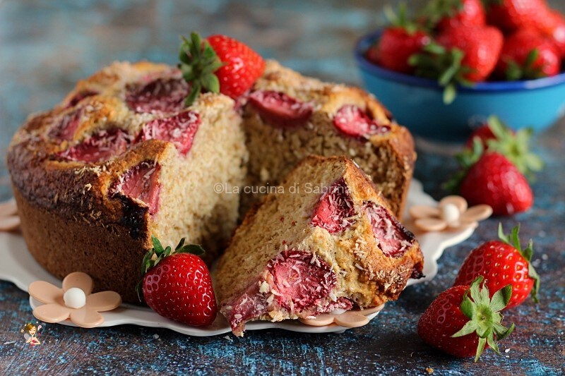 – Polvilhar a superfície com coco ralado (rapê) e assar em forno quente por cerca de 45/50′ (verificar com um palito que deve sair seco). Fora do forno, aguardar cerca de dez minutos e depois virar o bolo integral de morango e coco sobre uma grade para esfriar.