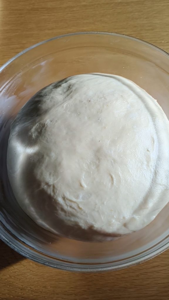 Deixar a massa levedar em uma tigela untada por 2/3 horas a 26/28°C coberta. (O forno desligado ou com uma luz acesa pode ajudar.) Deve triplicar.