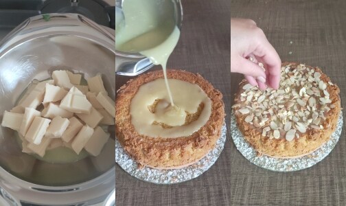 – Derreta o chocolate branco em banho-maria com as 2 colheres de creme de limoncello (ou limoncello), vire o bolo para ter uma base mais reta e cubra a superfície. Decore com lascas de amêndoas e raspas de chocolate branco (opcional)
