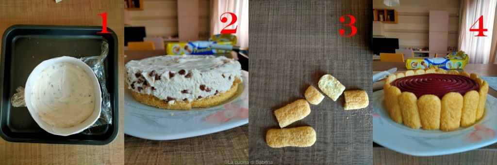 Colocar o disco de gelatina de frutas vermelhas na superfície, retirar o anel, o papel manteiga e o filme plástico, 2 apoiar o doce sobre um prato de servir ou um suporte e 3 decorar com os pavesini (ligeiramente cortados no tamanho certo), exercendo uma leve pressão, 4 revestindo todo o perímetro do doce.