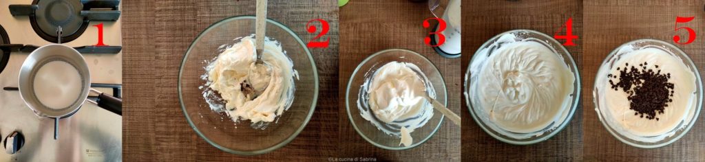 – Reidratar a gelatina com a água, e enquanto isso, trabalhar a ricota com o açúcar e a baunilha para deixá-la lisa. 1 Aquecer até quase ferver 50 g de creme de leite, retirar do fogo e adicionar a gelatina; misturar e aguardar alguns minutos. 2 À parte, bater levemente 200 g do creme de leite previsto, 3 adicionar à ricota junto com o creme de leite reservado. 4 Misturar tudo, também com batedeira elétrica por alguns segundos e 5 por fim adicionar as gotas de chocolate misturando para que se distribuam de maneira uniforme.