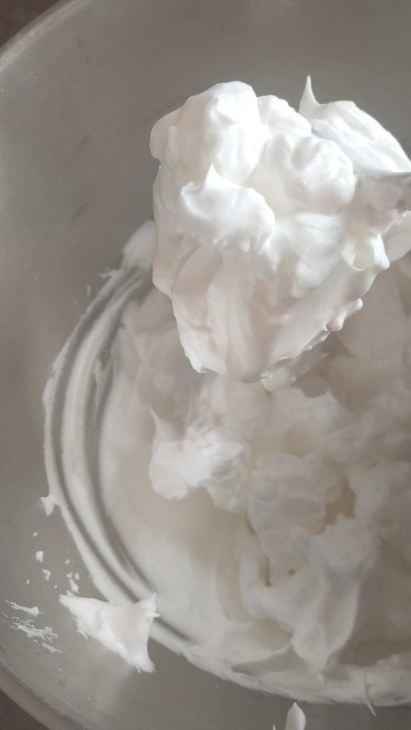 – Coloque na batedeira o cremor tártaro e metade do açúcar previsto junto com as claras e bata até obter um merengue bem firme e brilhante.