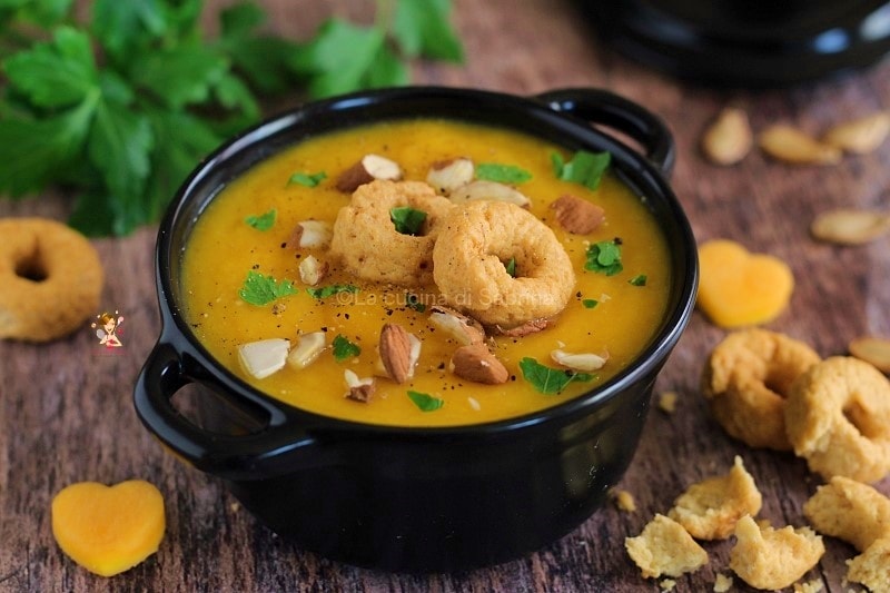 Quando preparo o creme de abóbora cozido na panela de pressão, adiciono, se desejar, nozes picadas e bacon defumado, também para suavizar um pouco o doce da abóbora. Muitas vezes, acrescento como guarnição e também para dar crocância, cogumelos salteados ou taralli esmigalhados com pimenta, e substituo o bacon por speck cortado em tiras.