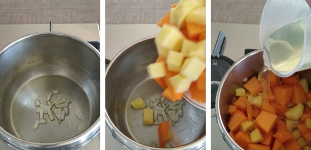– Refogue a cebola em 2 colheres de sopa de óleo, adicione abóbora e batata e deixe pegar sabor. Neste ponto, adicione o caldo quente e cozinhe na panela de pressão, calculando que para a batata são necessários 6 minutos de cozimento após o apito.