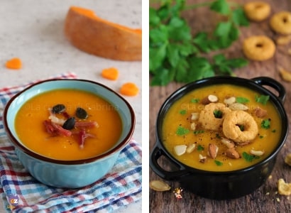 Quando preparo o creme de abóbora cozido na panela de pressão, adiciono, se desejar, nozes picadas e bacon defumado, também para suavizar um pouco o doce da abóbora. Muitas vezes, acrescento como guarnição e também para dar crocância, cogumelos salteados ou taralli esmigalhados com pimenta, e substituo o bacon por speck cortado em tiras.