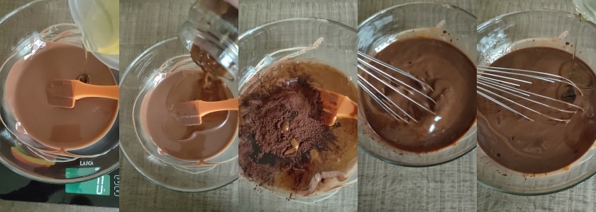 – Transfira para uma tigela o chocolate ao leite derretido no micro-ondas e 30 g de óleo de arroz, adicione a pasta de avelã, a baunilha e o cacau amargo peneirado, mexa com o batedor de mão para tirar os grumos.