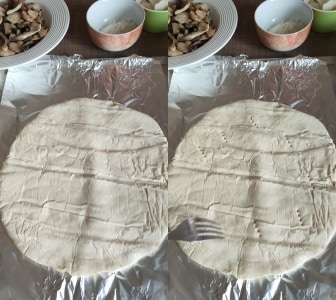 – Desenrole a base para a focaccia diretamente na assadeira forrada com alumínio ou um novo papel manteiga (removendo o da embalagem) e fure o fundo.
