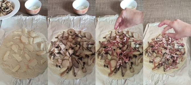 – Adicionar a scamorza cortada em fatias, os cogumelos, o speck e polvilhar com parmesão a gosto.