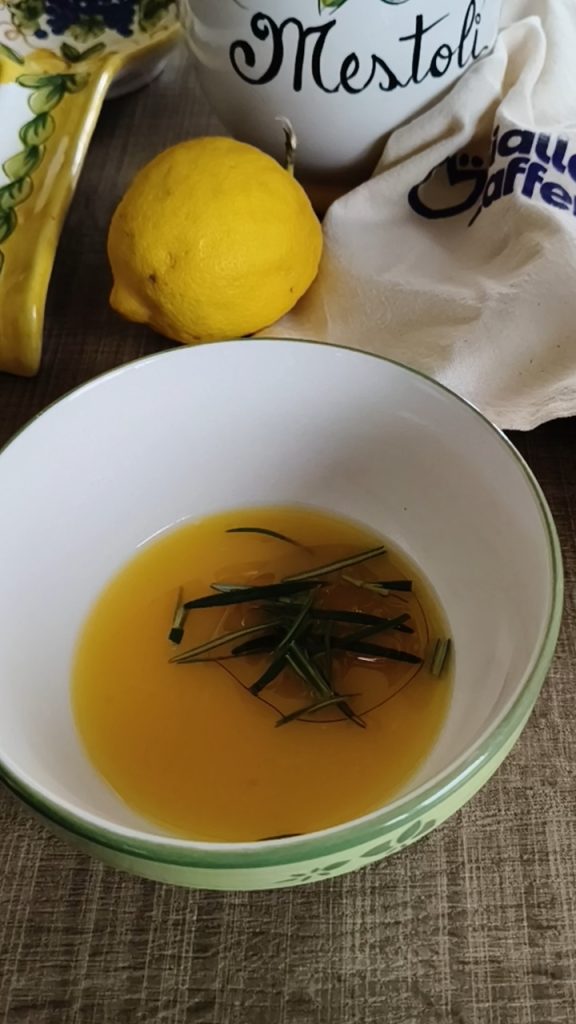 Coloque em uma tigela os sucos espremidos da laranja e do limão, adicione o alecrim, o azeite e emulsione com um garfo.