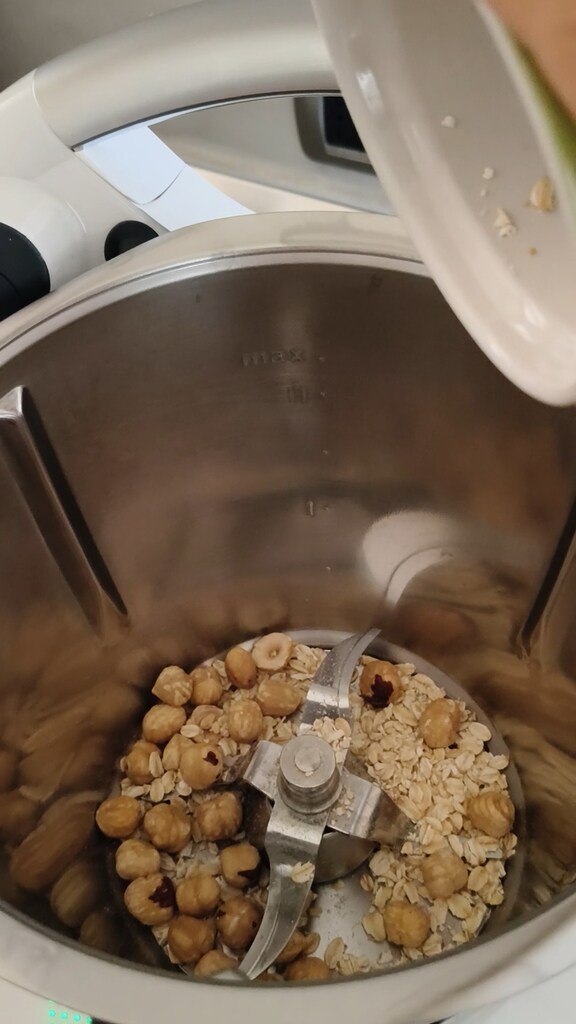 Coloque no copo as avelãs e uma colher de flocos de aveia retirados do total. Feche com o medidor na tampa e triture 1 seg / Turbo; verifique e, se necessário, repita. Depois, transfira a mistura para uma tigela pequena e continue.