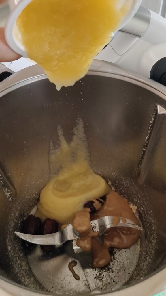 Coloque as tâmaras sem caroço (se estiverem duras, deixe amolecer por 10′ em água quente), o creme de frutas secas, a baunilha e a polpa de maçã; 10 seg / vel 4.