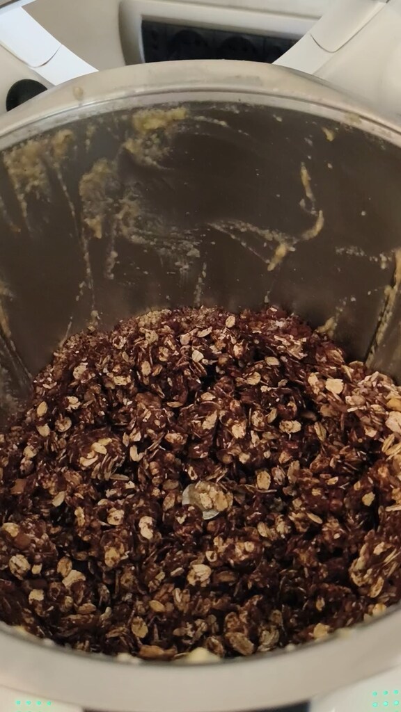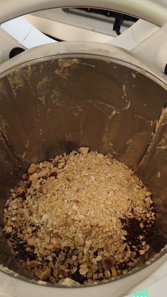 Limpe as bordas do copo com a espátula e adicione todos os outros ingredientes (exceto as gotas de chocolate) e as avelãs previamente trituradas: 20 seg / sentido inverso / vel 2, espatulando se necessário.