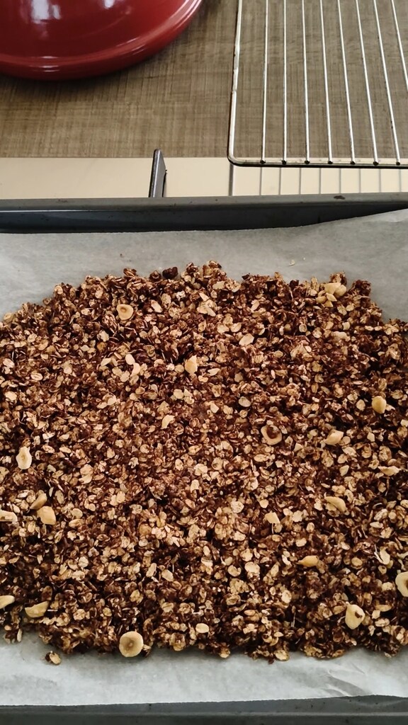 Espalhe a granola em uma assadeira forrada com papel manteiga e asse por cerca de 20 minutos.