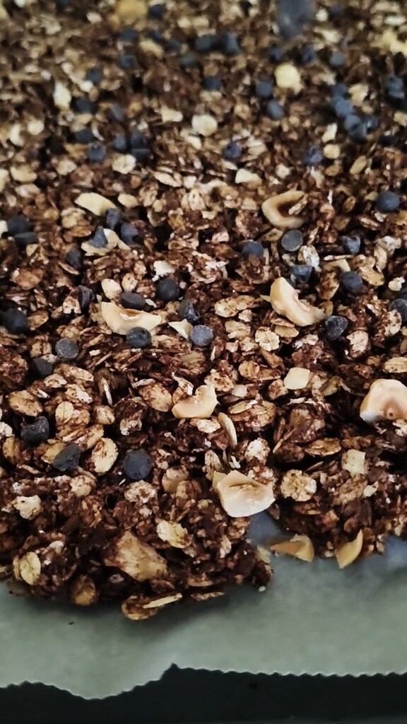 Fora do forno, espere até que a granola esteja completamente fria e depois adicione as gotas de chocolate e conserve em um pote.