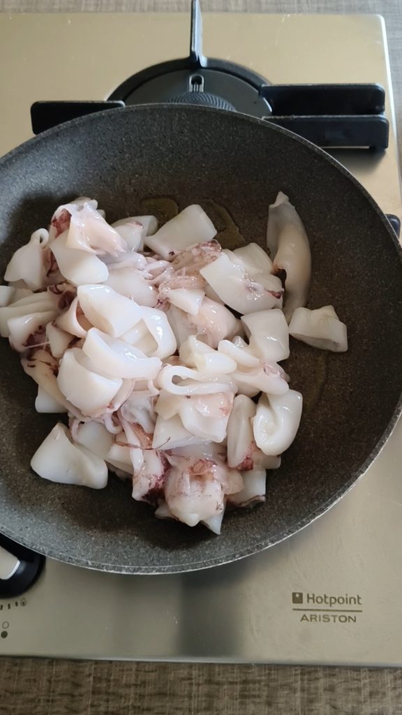 Aqueça o azeite em uma panela com um pouco de alho (se gostar) e doure rapidamente as lulas; elas devem apenas ganhar cor. Ajuste o sal.
