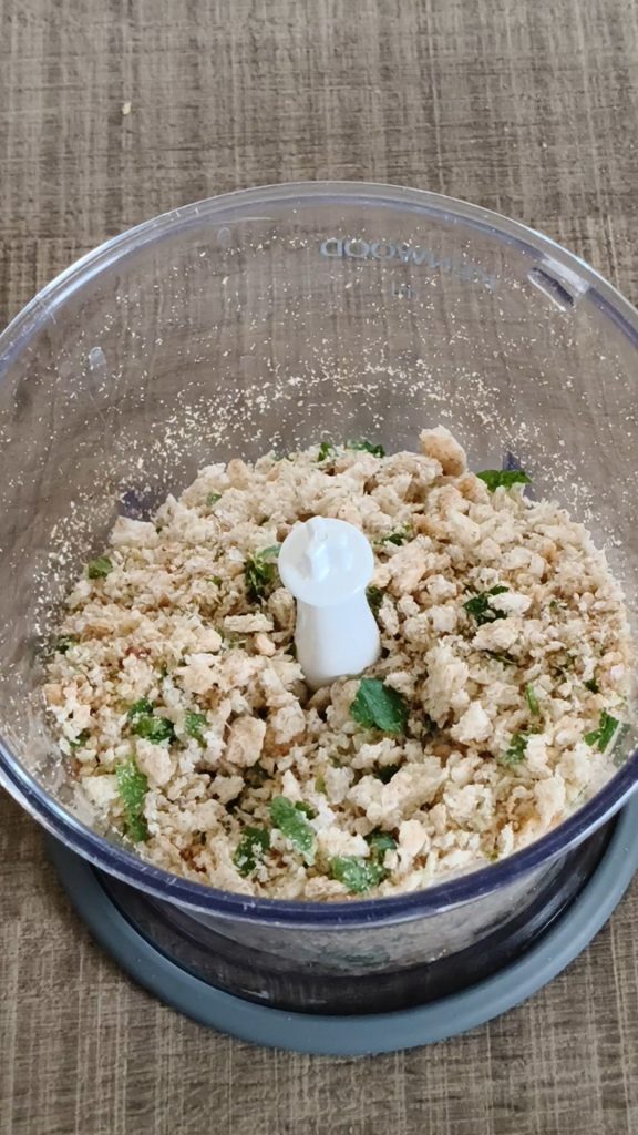 No copo do processador de alimentos, coloque as fatias de pão seco ou pão de forma (sempre seco), o alho em pó ou fresco e um ramo de salsinha.