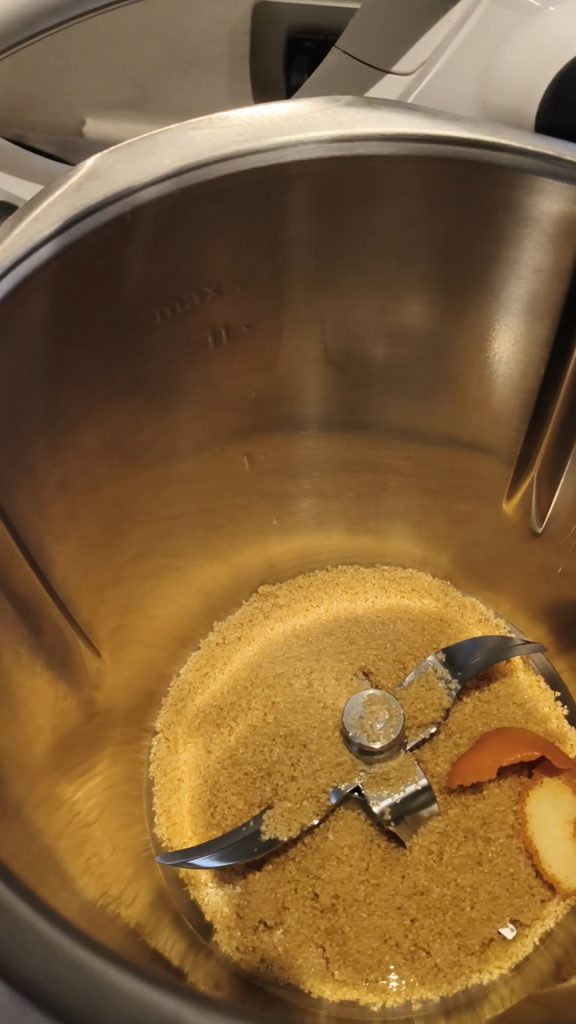 Pulverize no copo o açúcar mascavo e a casca de laranja: 15 segundos/vel. 10. Se a casca não estiver totalmente pulverizada, com mais 5/7 segundos ainda na vel. 10 ficará tudo perfeito. Este passo serve para deixar a massa mais fina.