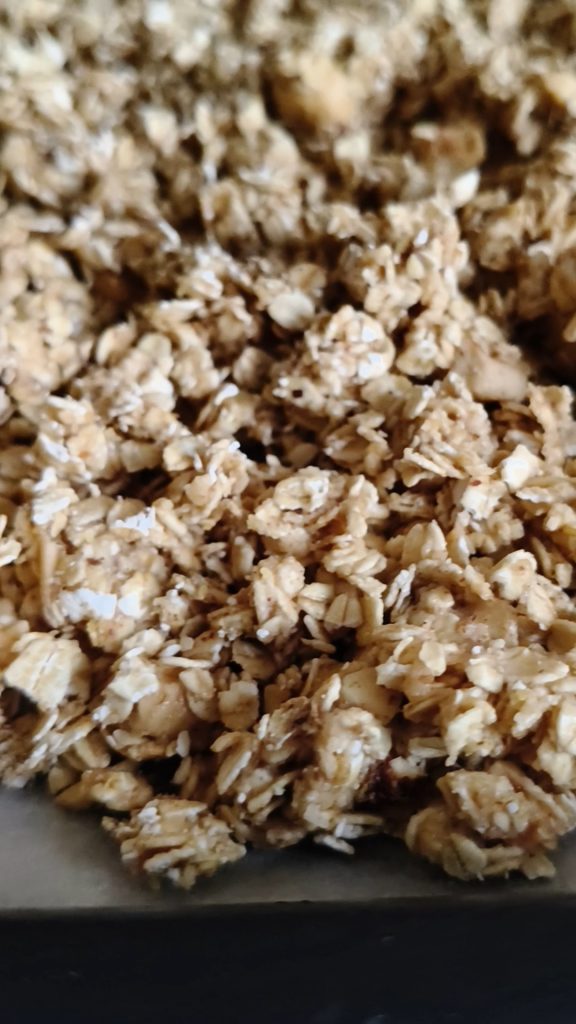 Misture bem e despeje tudo em uma assadeira forrada com papel manteiga. Asse em forno pré-aquecido a 150 °C ventilado ou 160 °C por 30-35 minutos. A baixa temperatura fará com que o muesli fique dourado sem escurecer.