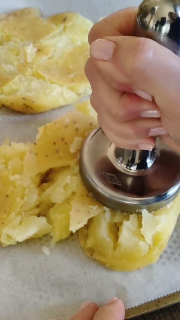 Lave e escove bem as batatas e cozinhe com um copo de água, inteiras, na panela de pressão por 5 minutos após o apito. Depois coloque-as em uma assadeira forrada com papel manteiga e amasse com o machucador ou um copo.