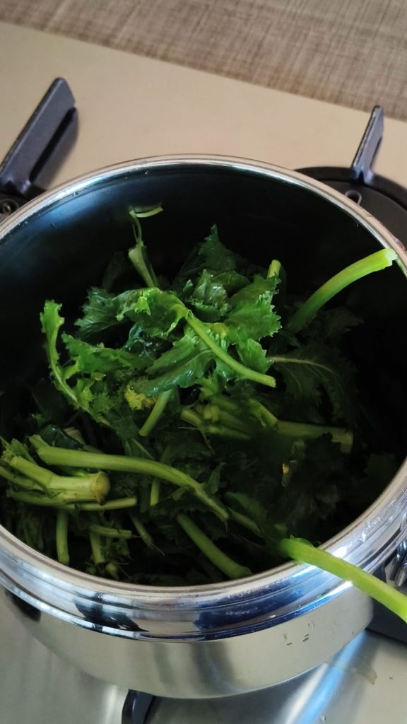 Escalde em pouca água na panela de pressão também o nabo (se a água das batatas estiver limpa, você pode reutilizá-la), depois de lavada, por 3 minutos após o apito.