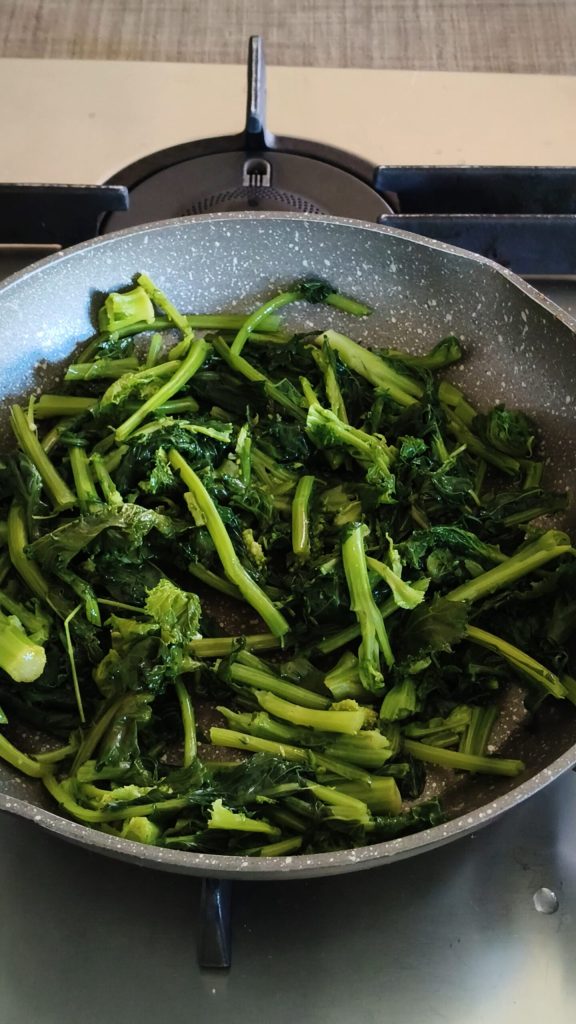 Depois refogue na frigideira com um fio de azeite, sal, alho e pimenta vermelha (se gostar).