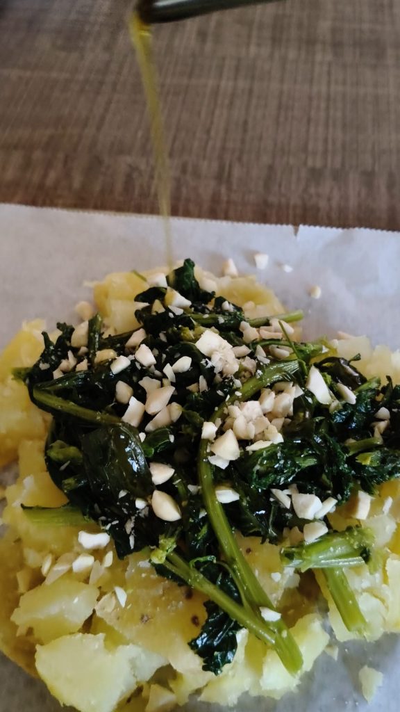 Esta receita nasce da ideia de transformar dois ingredientes simples da tradição em uma proposta original e incomum, pronta para surpreender também à mesa. As batatas são cozidas, depois amassadas diretamente com a casca até formarem pequenos “tortinhos” crocantes e dourados.