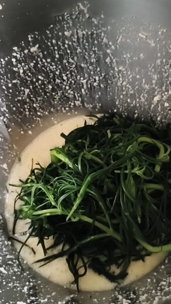 Se você não tem o Bimby, proceda levando a água a ferver numa panela, adicione uma pitada de sal, os agretti lavados e limpos e cozinhe por cerca de 4–6 minutos. Devem ficar macios.