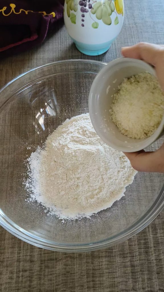 Coloque em uma tigela a farinha peneirada, o sal, o fermento para tortas salgadas e o parmesão ralado.