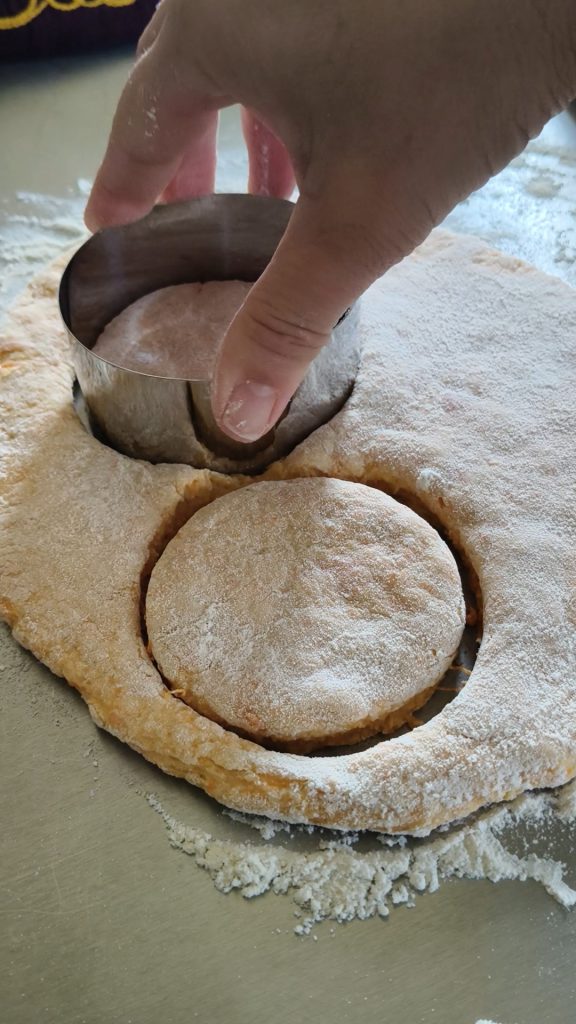 Estenda a massa com cerca de 1 cm na superfície levemente enfarinhada, polvilhe também a superfície e corte as panquequinhas com um copo ou cortador de massa.