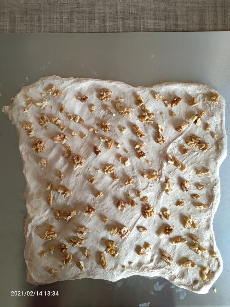 – Na bancada levemente enfarinhada, abra a massa delicadamente com as mãos úmidas e polvilhe com as nozes.