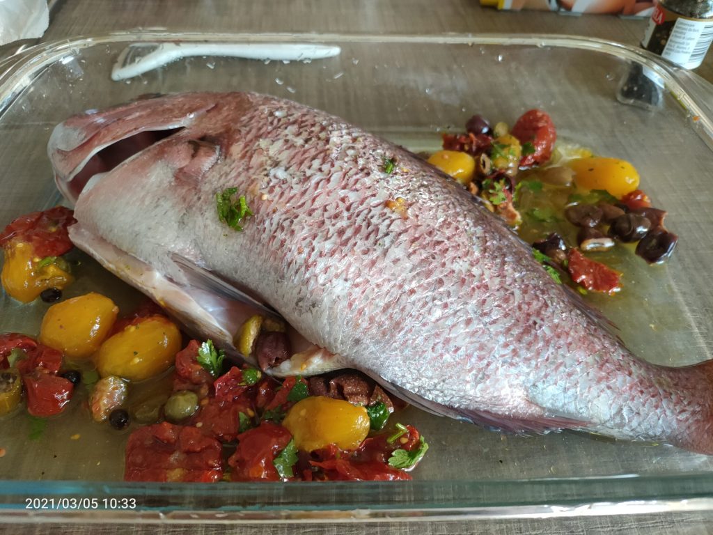 – Colocar o peixe em uma assadeira grande e cercá-lo com os tomates secos (primeiro bem enxugados), os tomatinhos amarelos e todos os outros ingredientes.
