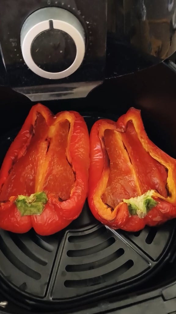 Lave, seque e corte os pimentões ao meio (no sentido do comprimento). Retire as sementes e os filamentos e unte-os por dentro e por fora com pouquíssimo óleo. Salgue levemente e cozinhe na fritadeira a ar a 180°C por 10-12 minutos, até que comecem a amolecer.
