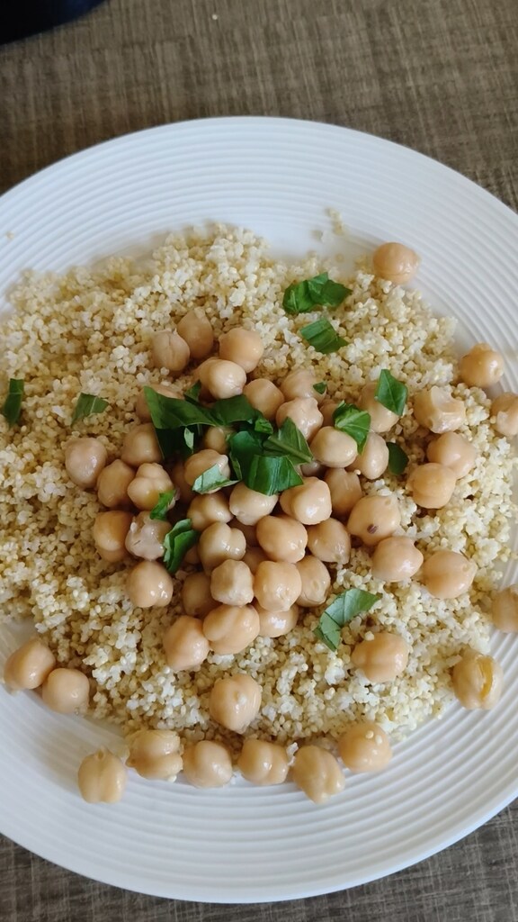 Escorra o painço e tempere com o grão-de-bico bem lavado do líquido de conserva e escorrido.
