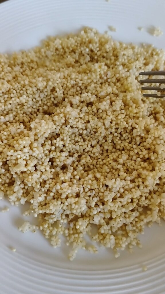 O painço deve ser cozido antes, assim como faria com arroz ou cuscuz. Você pode cozinhá-lo no Bimby, em panela ou usar a função “Cozimento de arroz” do TM6.