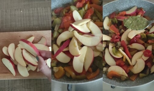 – Fatiar a maçã previamente lavada e retirada as sementes, e adicioná-la na frigideira com os legumes; misturar e temperar com algumas colheres de pesto.