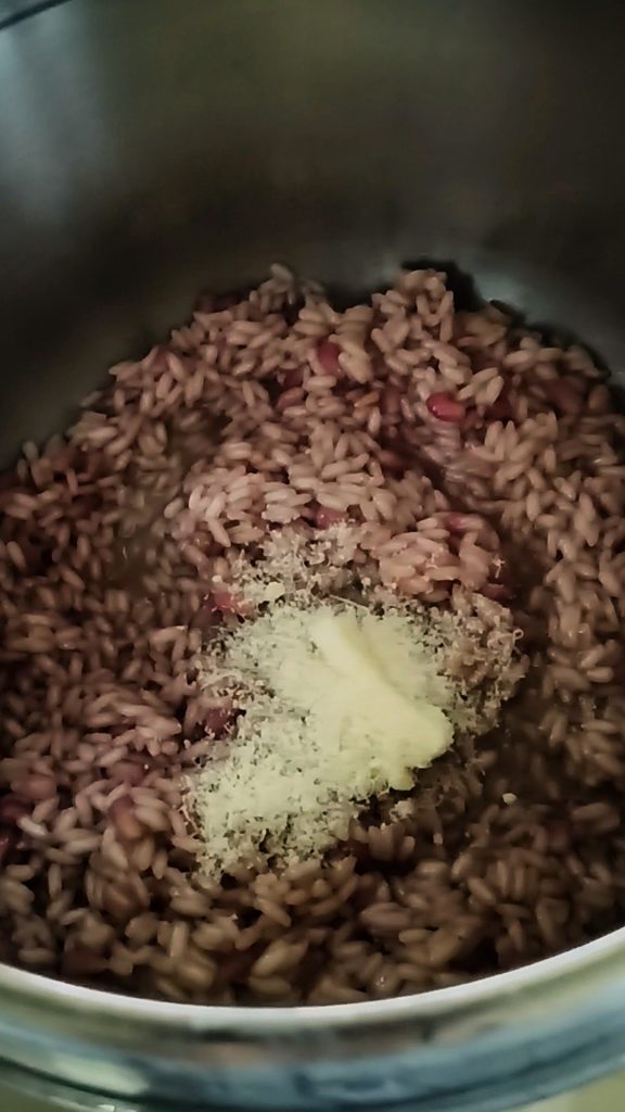A preparação é surpreendentemente simples: tostar o arroz, adicionar caldo quente e grãos de romã, e depois colocar na pressão.